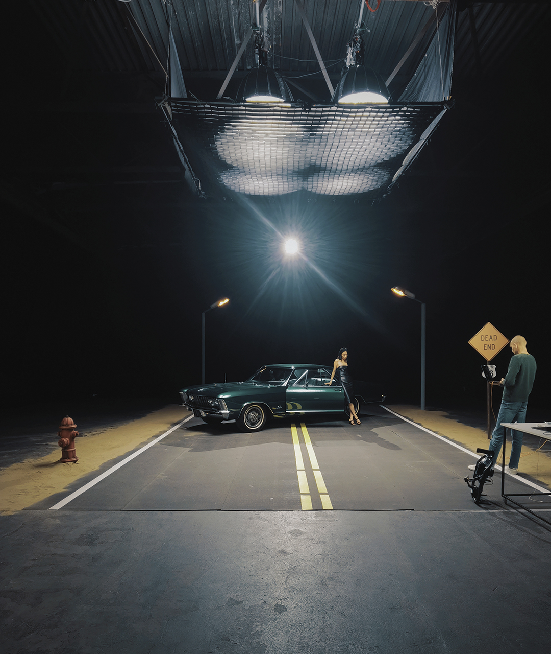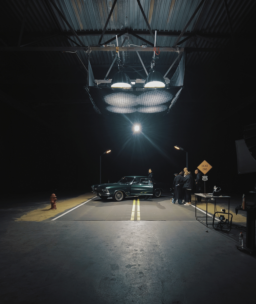• Зйомка авто в павільйоні: Головним акцентом став ретро-автомобіль, який заїхав безпосередньо на збудовану локацію. Габарити Stage 3 дозволили вільно маневрувати авто та виставляти світлові прилади на великій відстані для імітації природного сонячного світла.