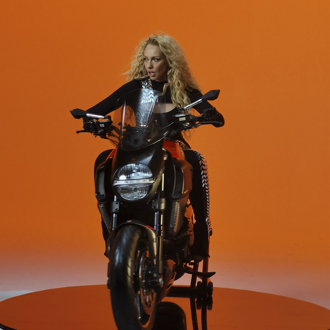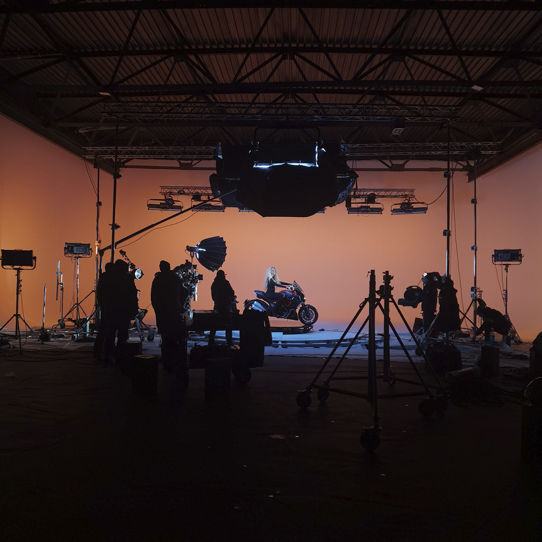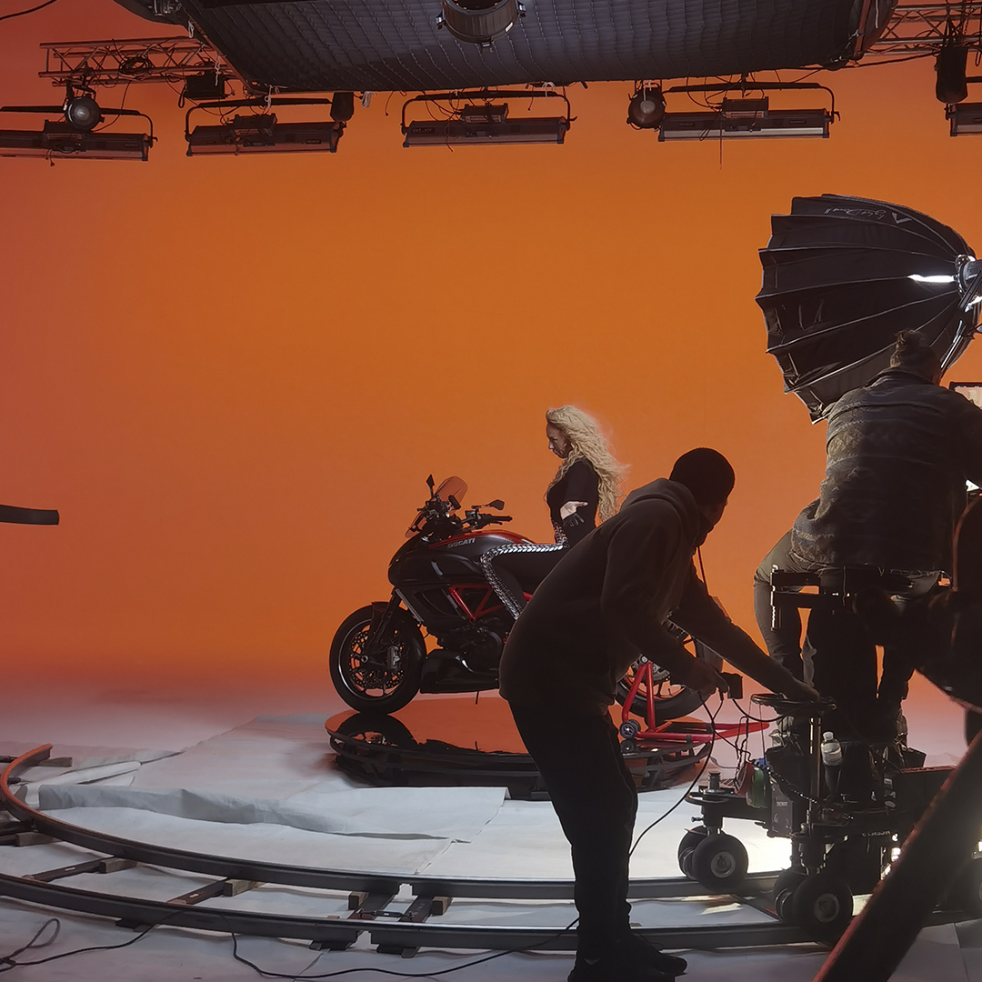 Транспорт у кадрі: Мотоцикл Ducati Diavel був встановлений на поворотну платформу, що у поєднанні з Dolly-системою (операторський візок) дозволило створити динамічні кругові обльоти на яскравому фоні.