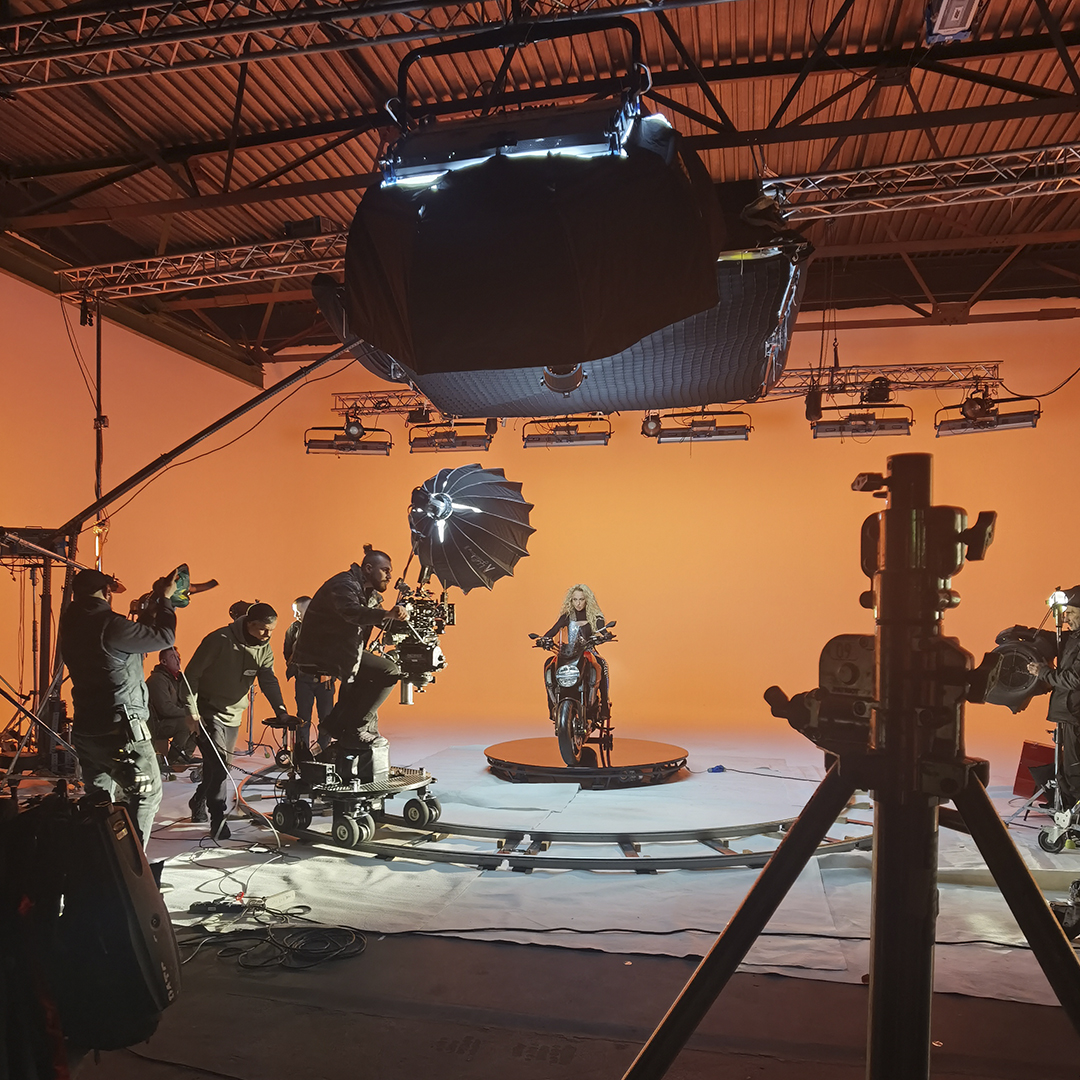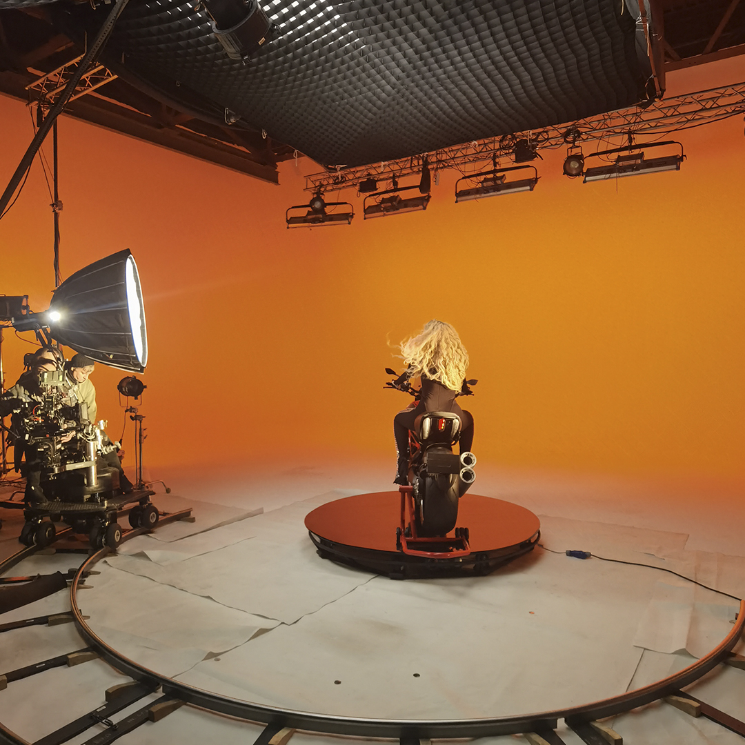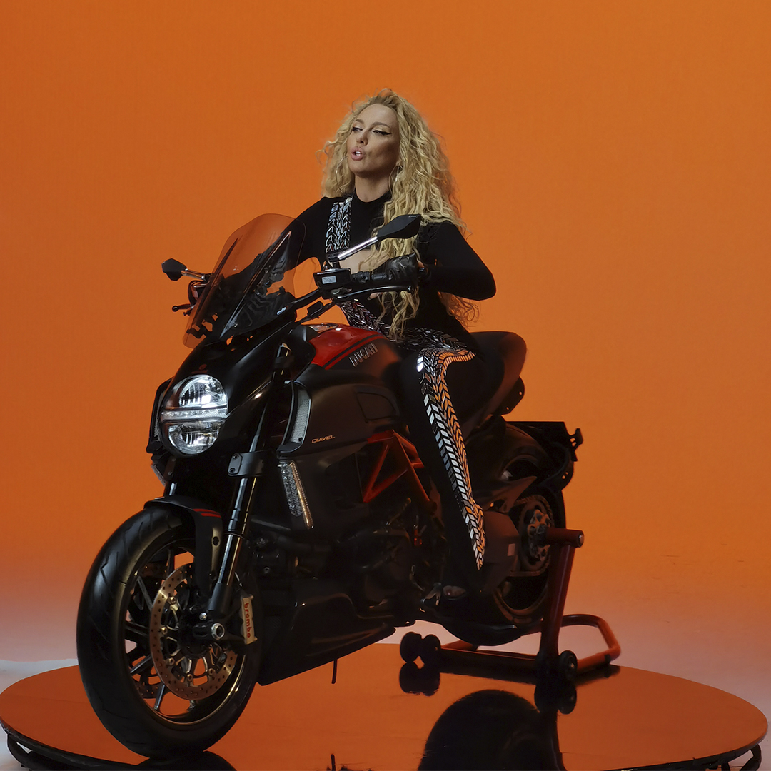 Транспорт у кадрі: Мотоцикл Ducati Diavel був встановлений на поворотну платформу, що у поєднанні з Dolly-системою (операторський візок) дозволило створити динамічні кругові обльоти на яскравому фоні.