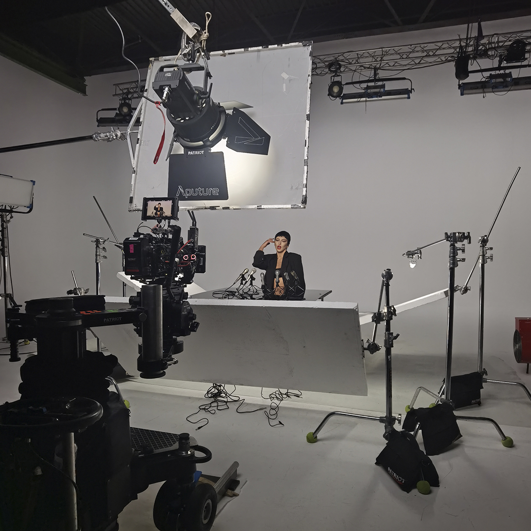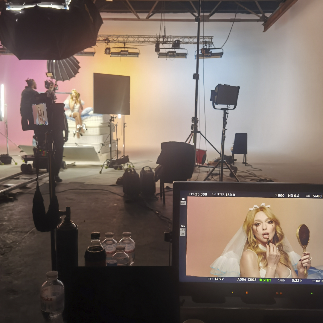 Hybrid Lighting: Поєднання Aputure для м'якого заповнення та ARRI SkyPanel для акцентних кольорових плям. Управління через DMX-пульт дозволяло миттєво змінювати атмосферу під новий образ.