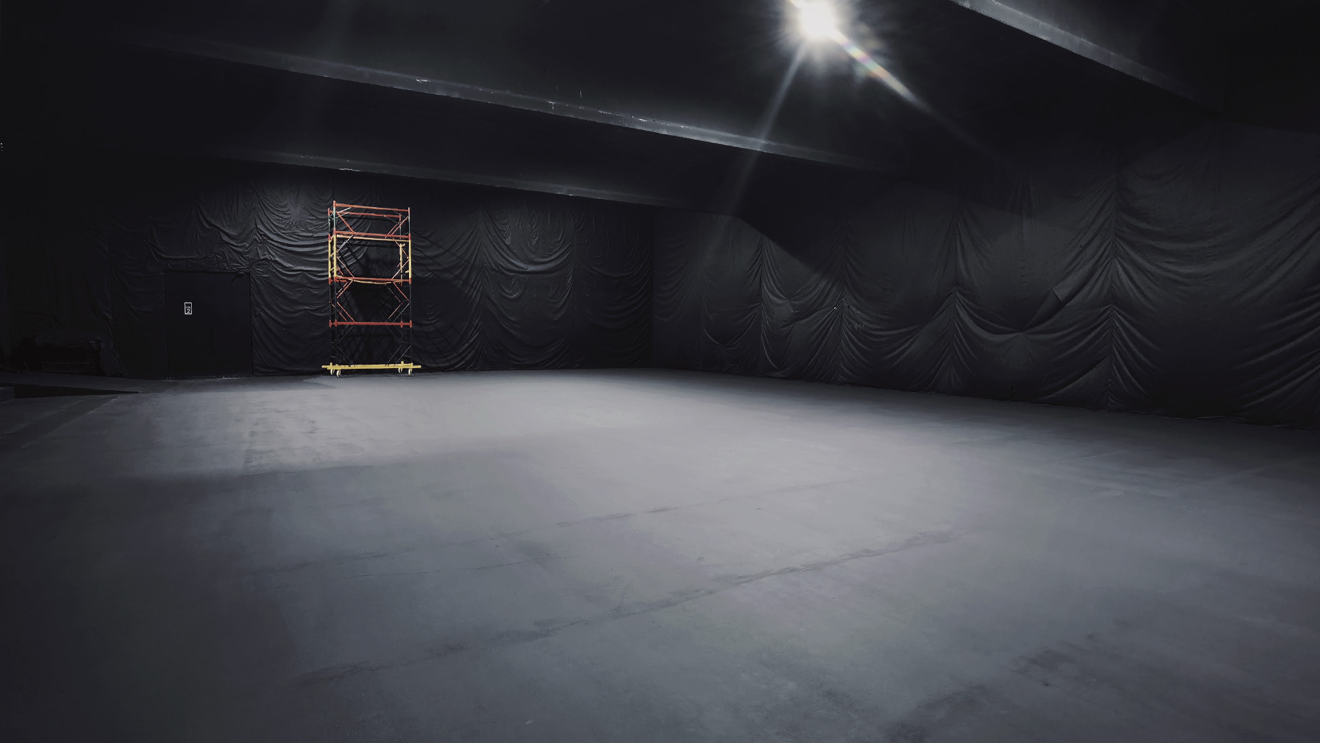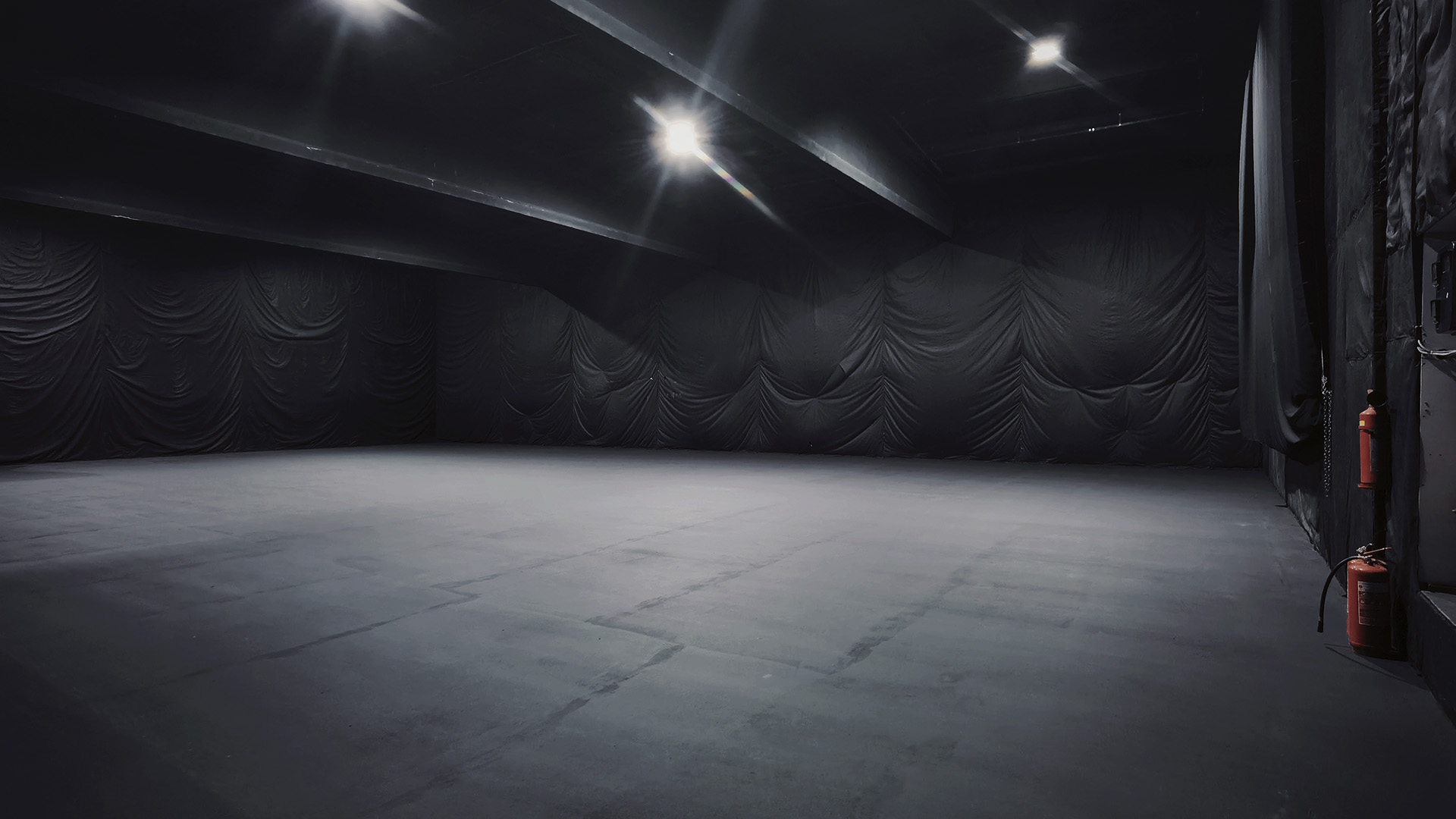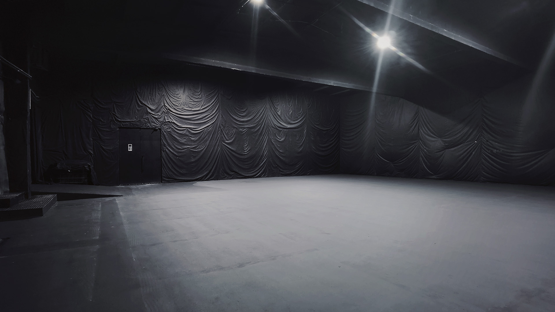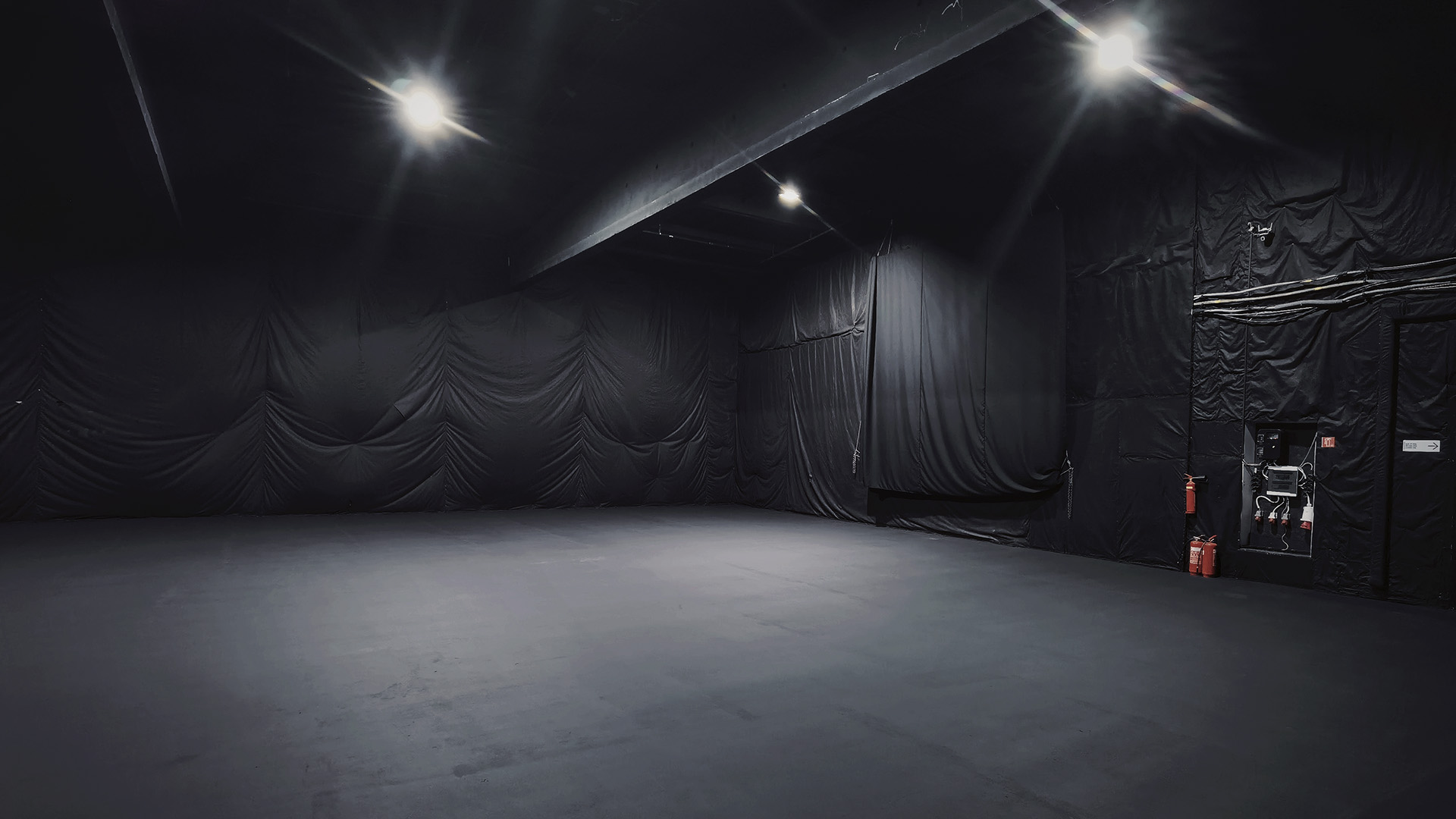 Простір площею 430м2 із висотою стелі до 6 метрів повністю оформлений у стилі TOTAL BLACK на всі 360°: стіни, підлога та стеля чорні, що дозволяє отримати максимальний ефект “провалу в темряву” для драматичних та стильних постановок.