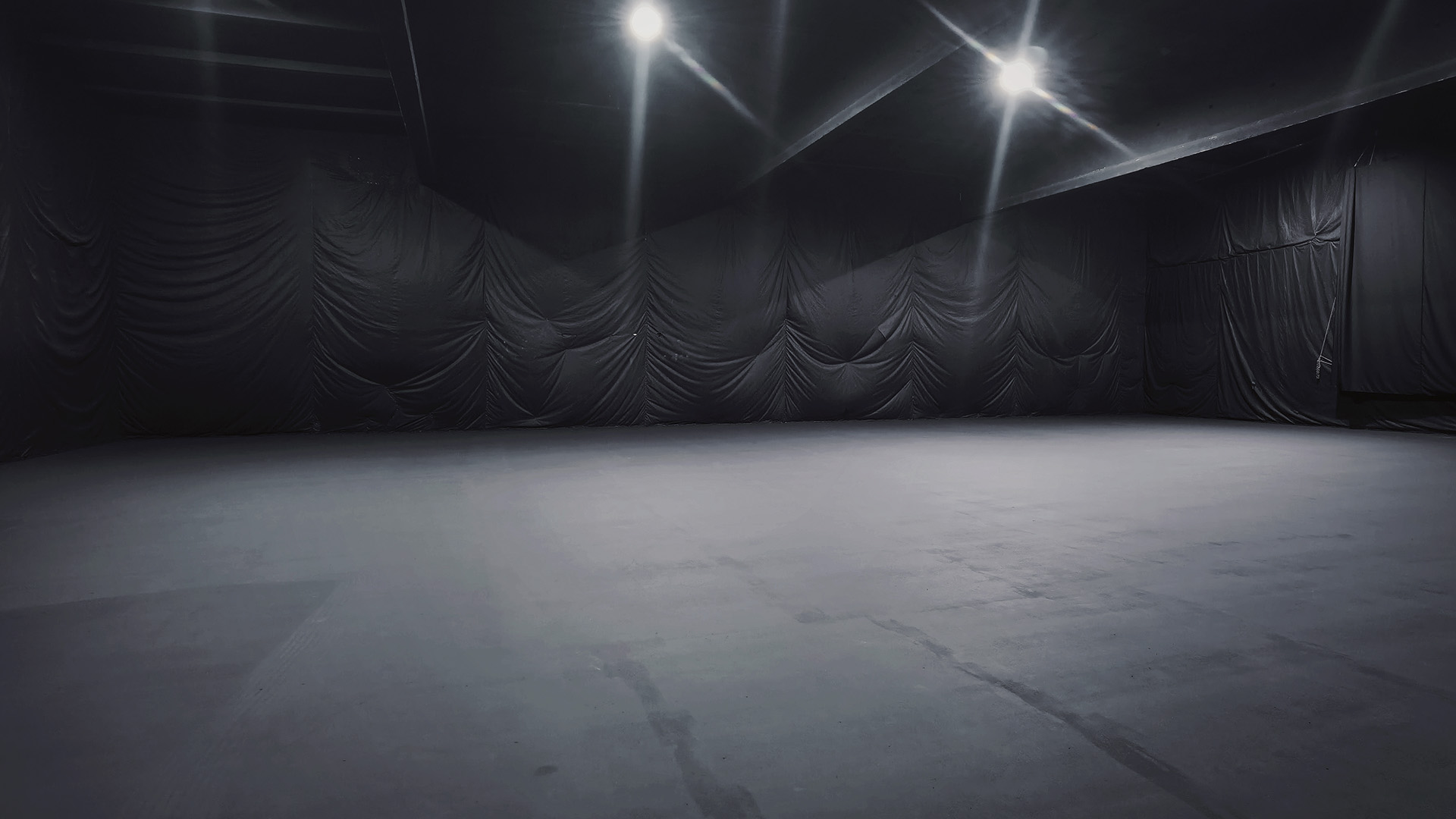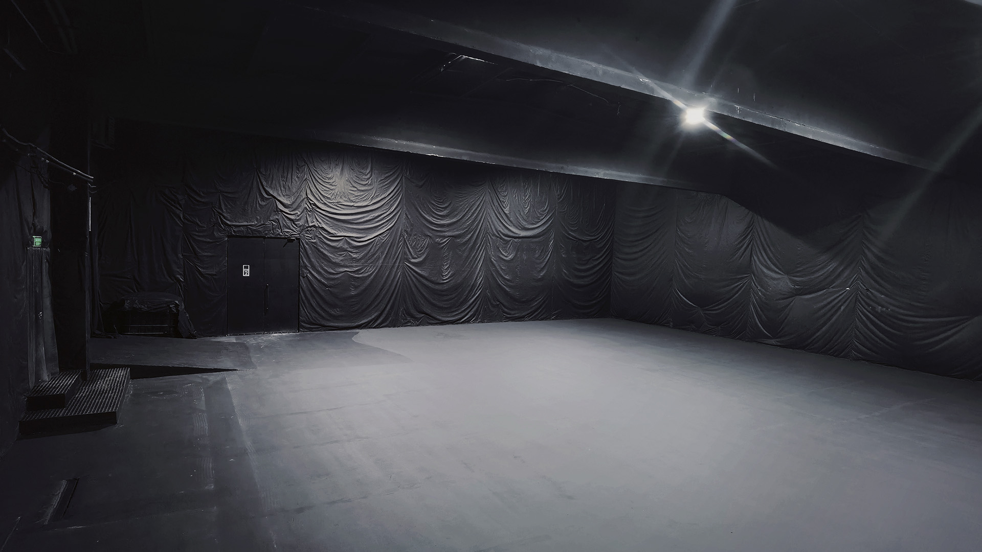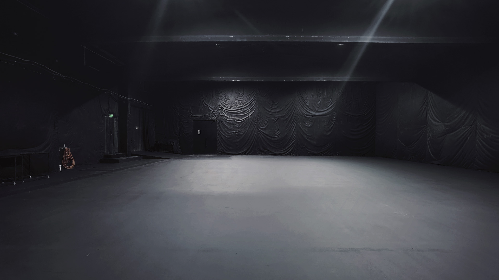 Простір площею 430м2 із висотою стелі до 6 метрів повністю оформлений у стилі TOTAL BLACK на всі 360°: стіни, підлога та стеля чорні, що дозволяє отримати максимальний ефект “провалу в темряву” для драматичних та стильних постановок.