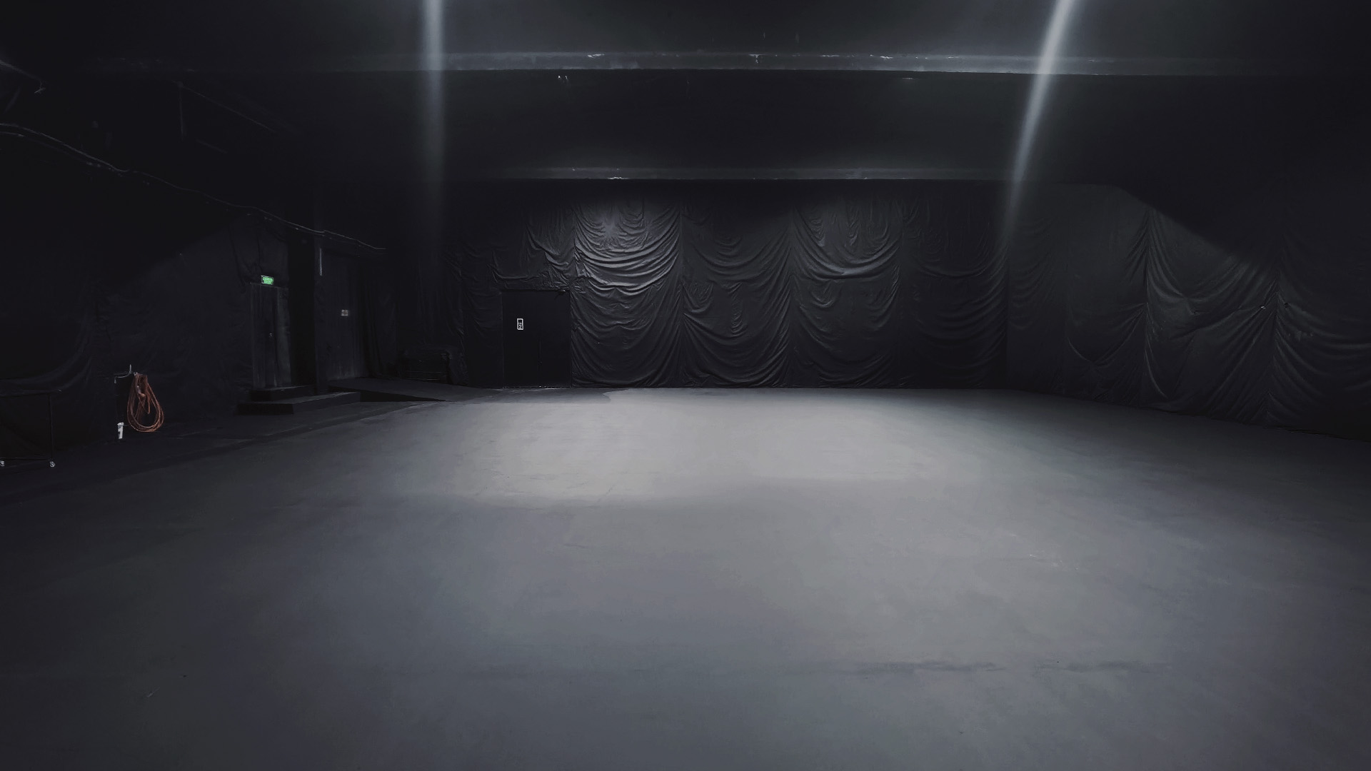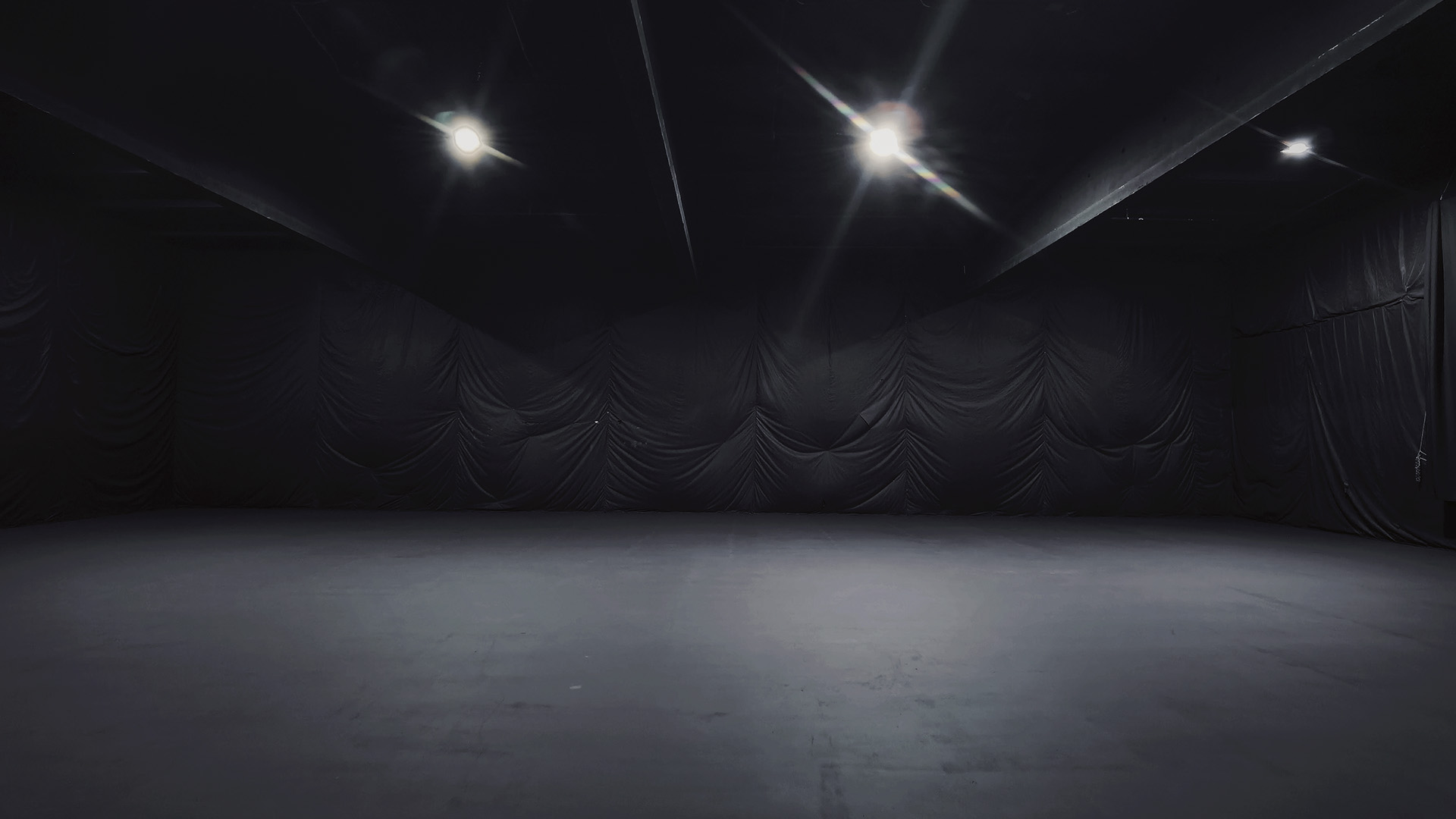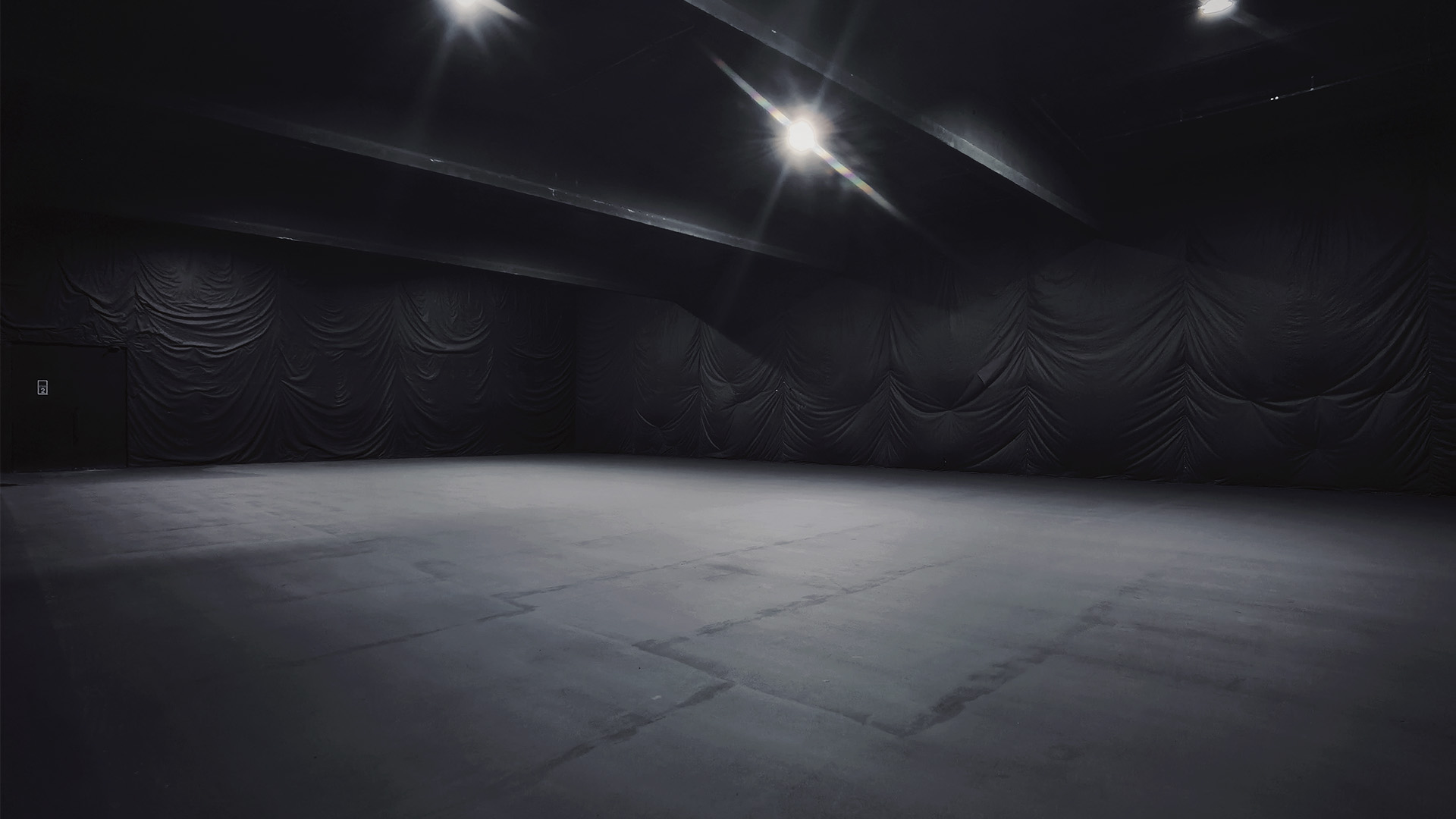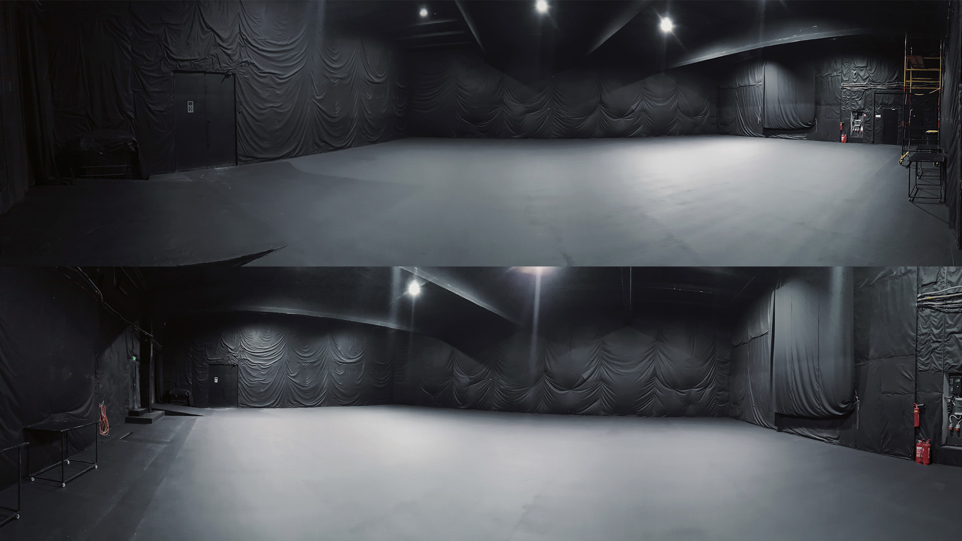 Простір площею 430м2 із висотою стелі до 6 метрів повністю оформлений у стилі TOTAL BLACK на всі 360°: стіни, підлога та стеля чорні, що дозволяє отримати максимальний ефект “провалу в темряву” для драматичних та стильних постановок.